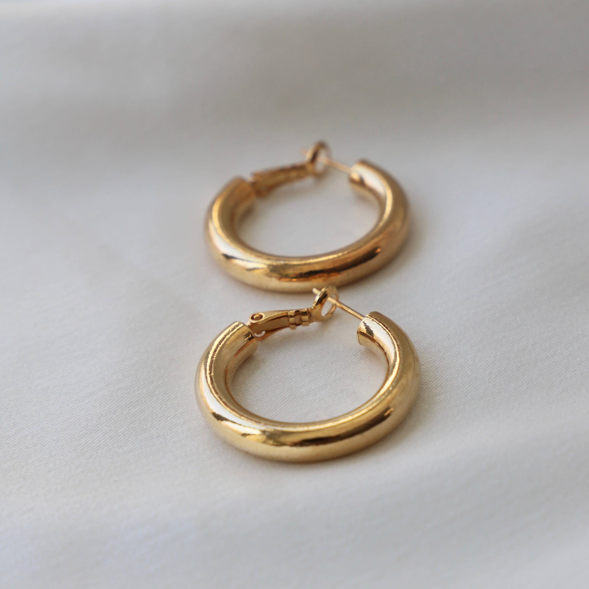 This medium thick hoop puts a modern spin on the classic hoop. We love to wear this sleek look on its own or with a simple stud. Materials: gold plate over brass Size: 5mm x 30mm