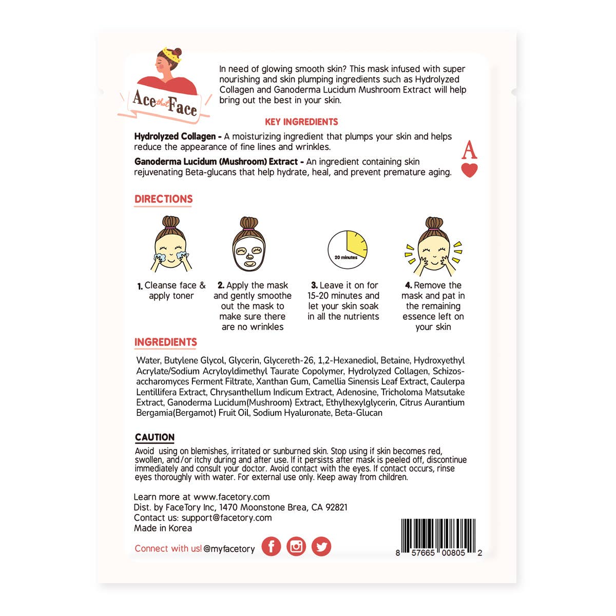 Ace your face using our sheet mask that is formulated to firm and plump the skin, nourish the skin with concentrated ingredients and protect the skin from environmental stressors! This product will leave your skin with a plump and dewy complexion, perfect for acing that face for the day!