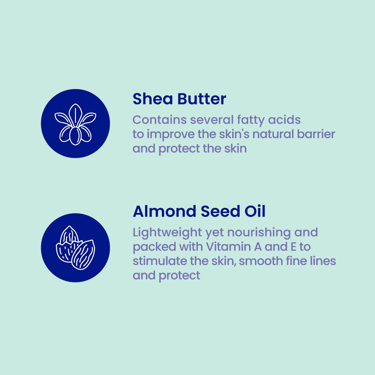 Key Ingredients & Benefits: 1. Almond Seed Oil - packed with Vitamin A and E to stimulate the production of new skin cells, smooth fine lines, and reduce UV damage to the skin. 2. Fermented Soymilk - a hydrating ingredient rich in antioxidants to help improve the skin barrier. 3. Shea Butter - contains several fatty acids to protect the skin from natural environmental damage.
